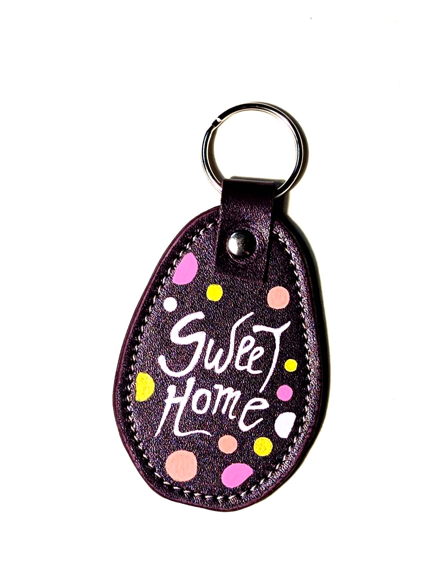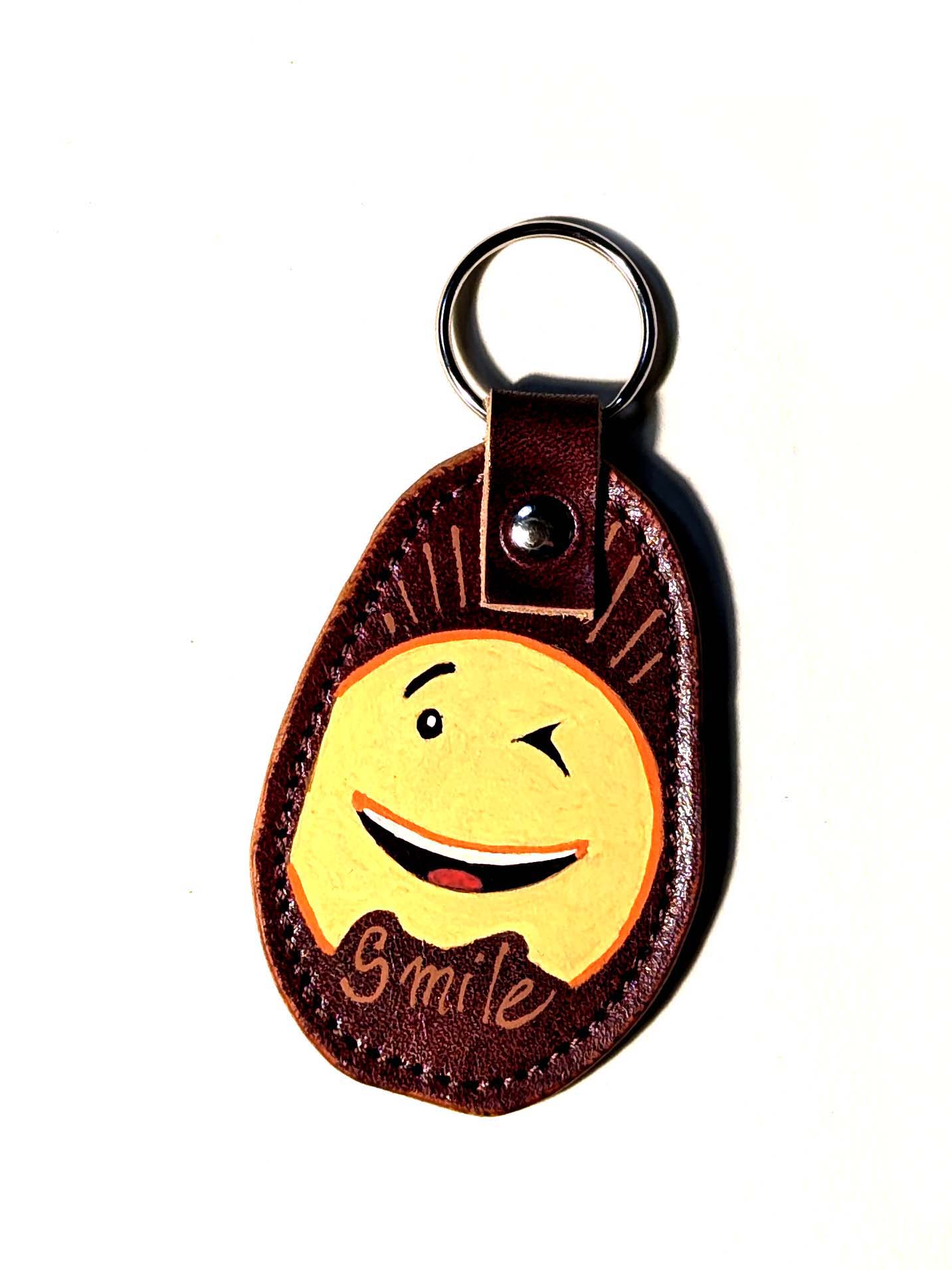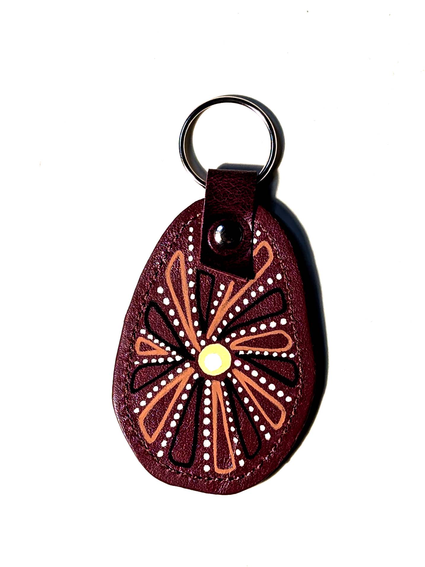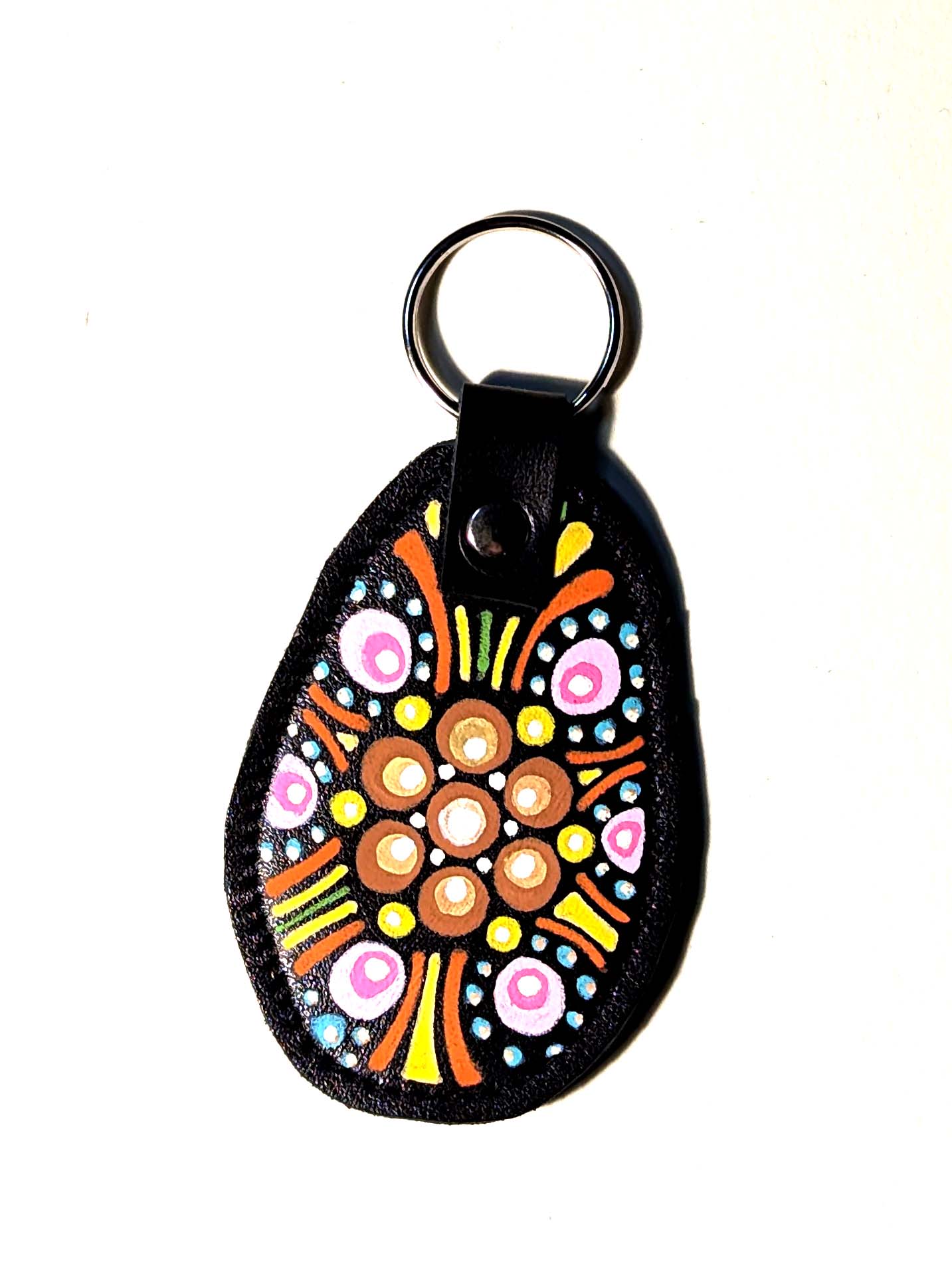 Portachiavi fatto a mano e decorato a mano con Uni Posca. Materiale: pelle Misura della parte in pelle: 7×5 cm