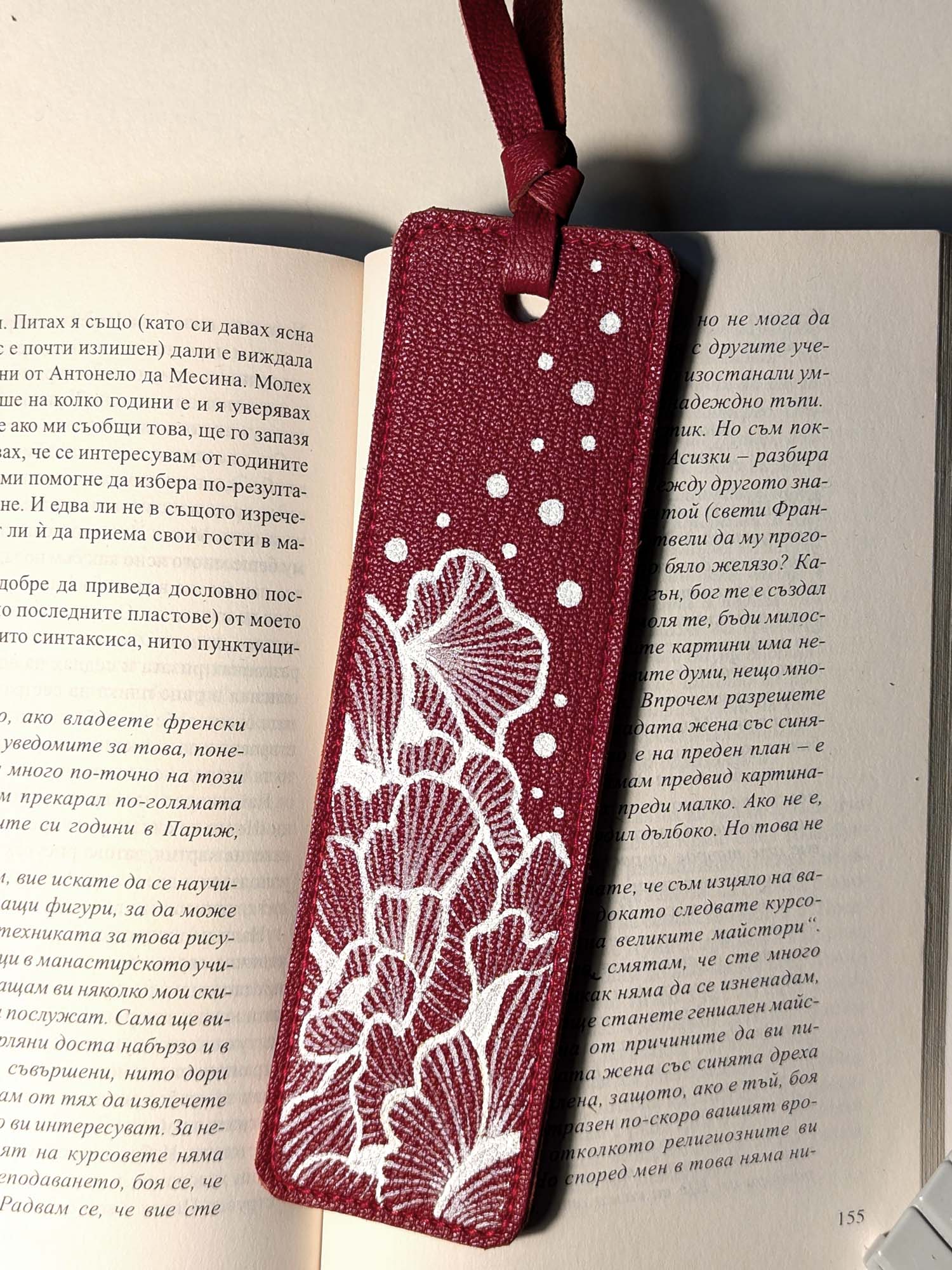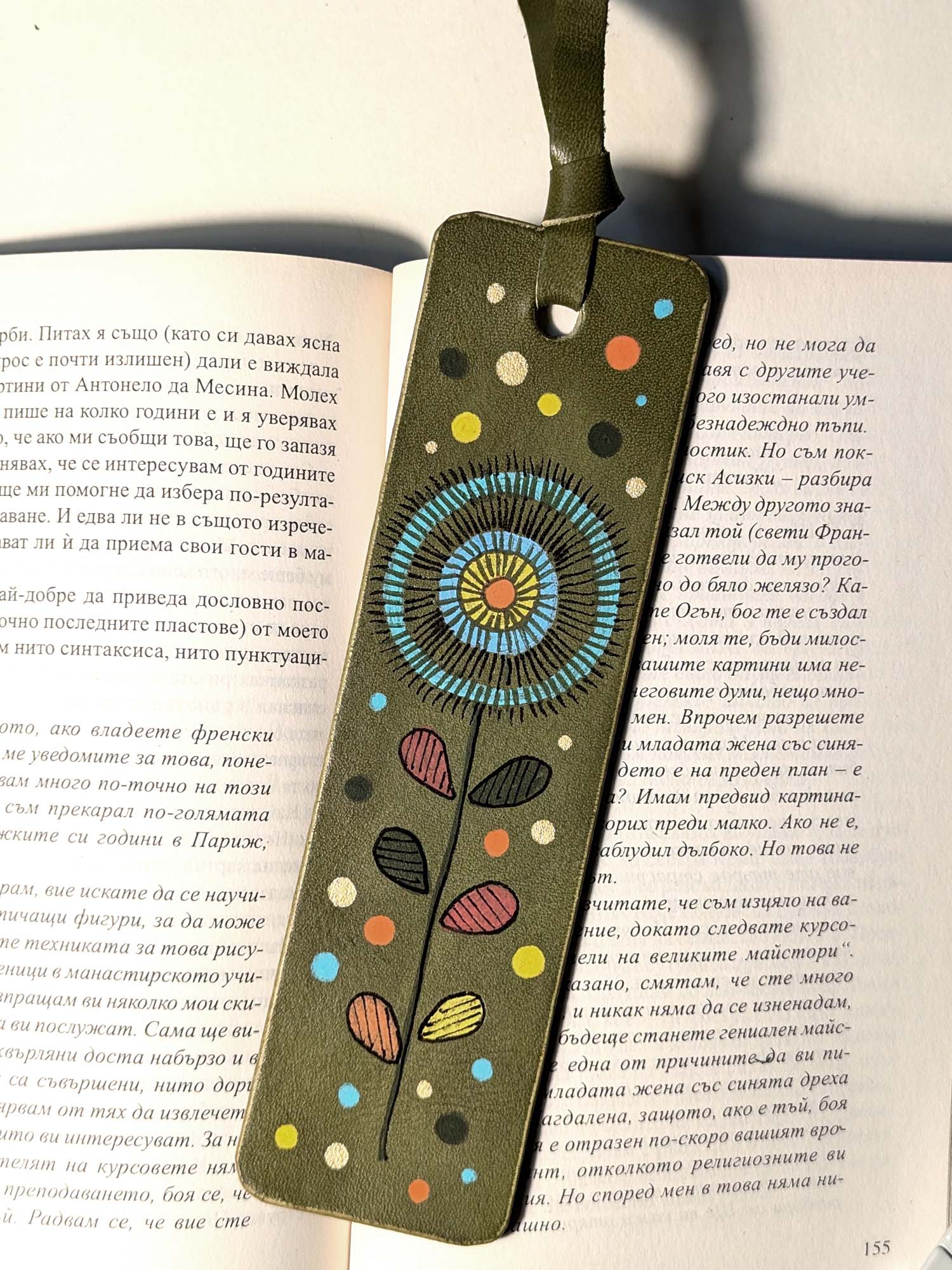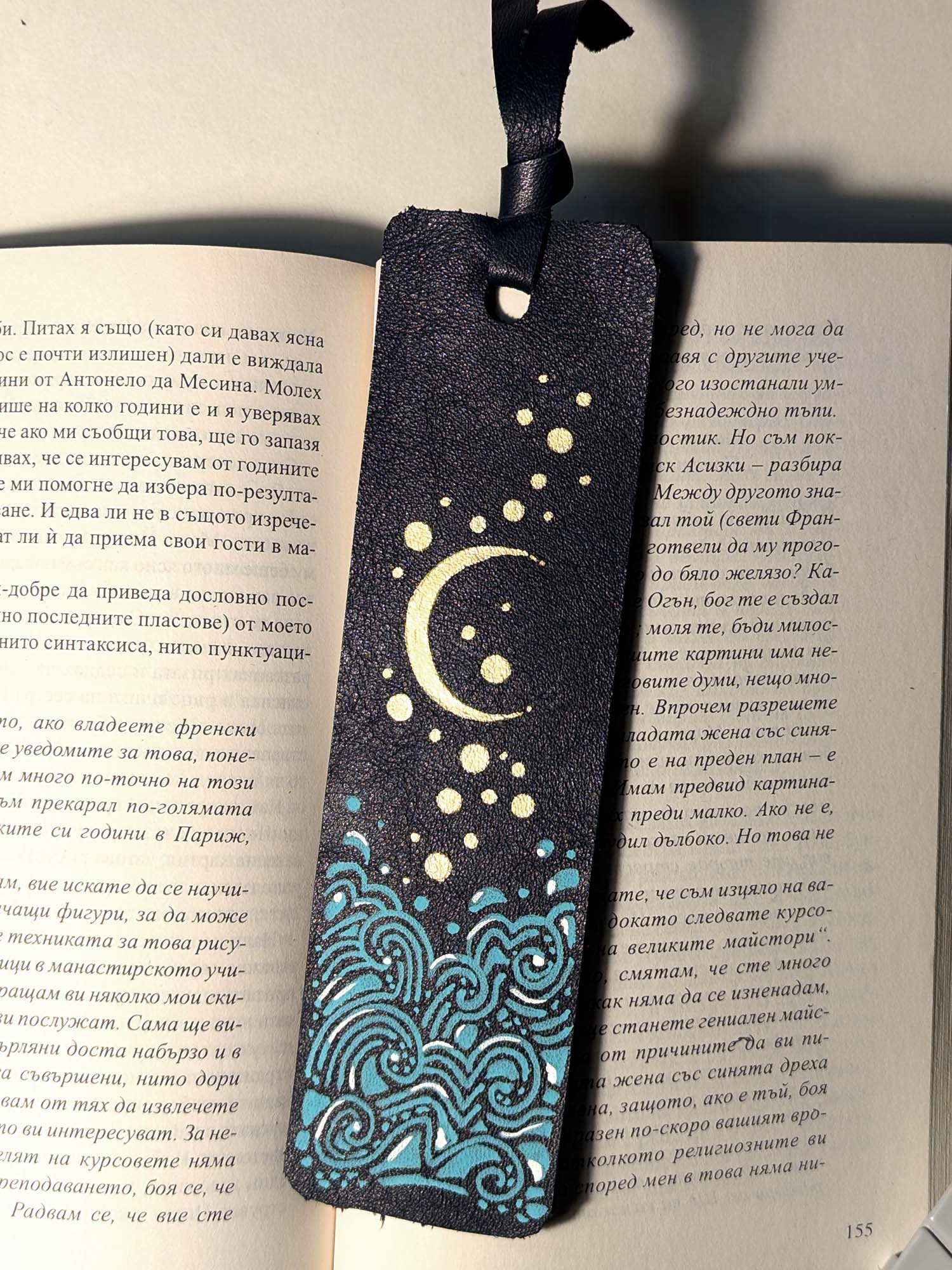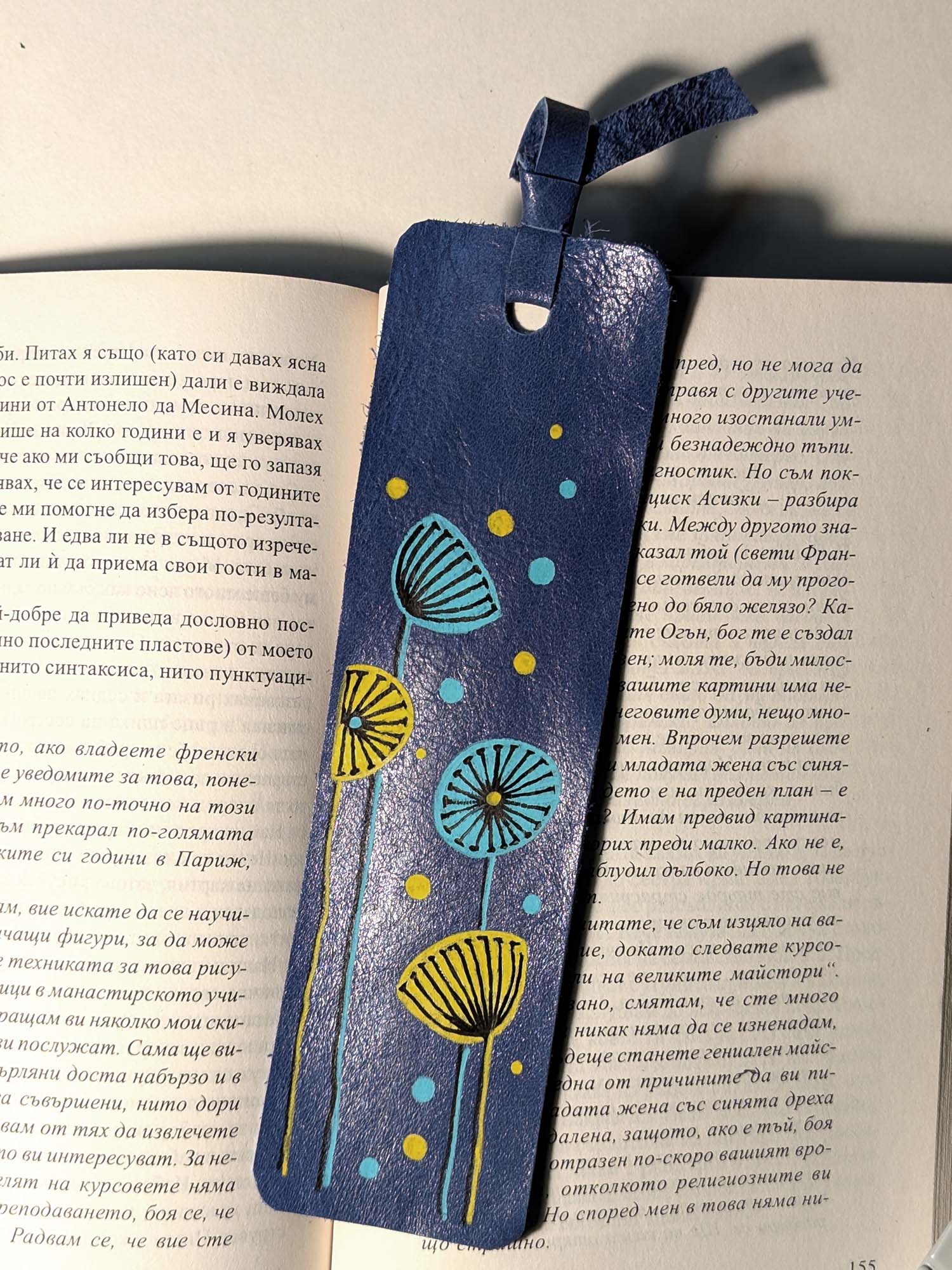 Segnalibro fatto a mano e decorato a mano con Uni Posca. Materiale: pelle Misura: 5×18 cm