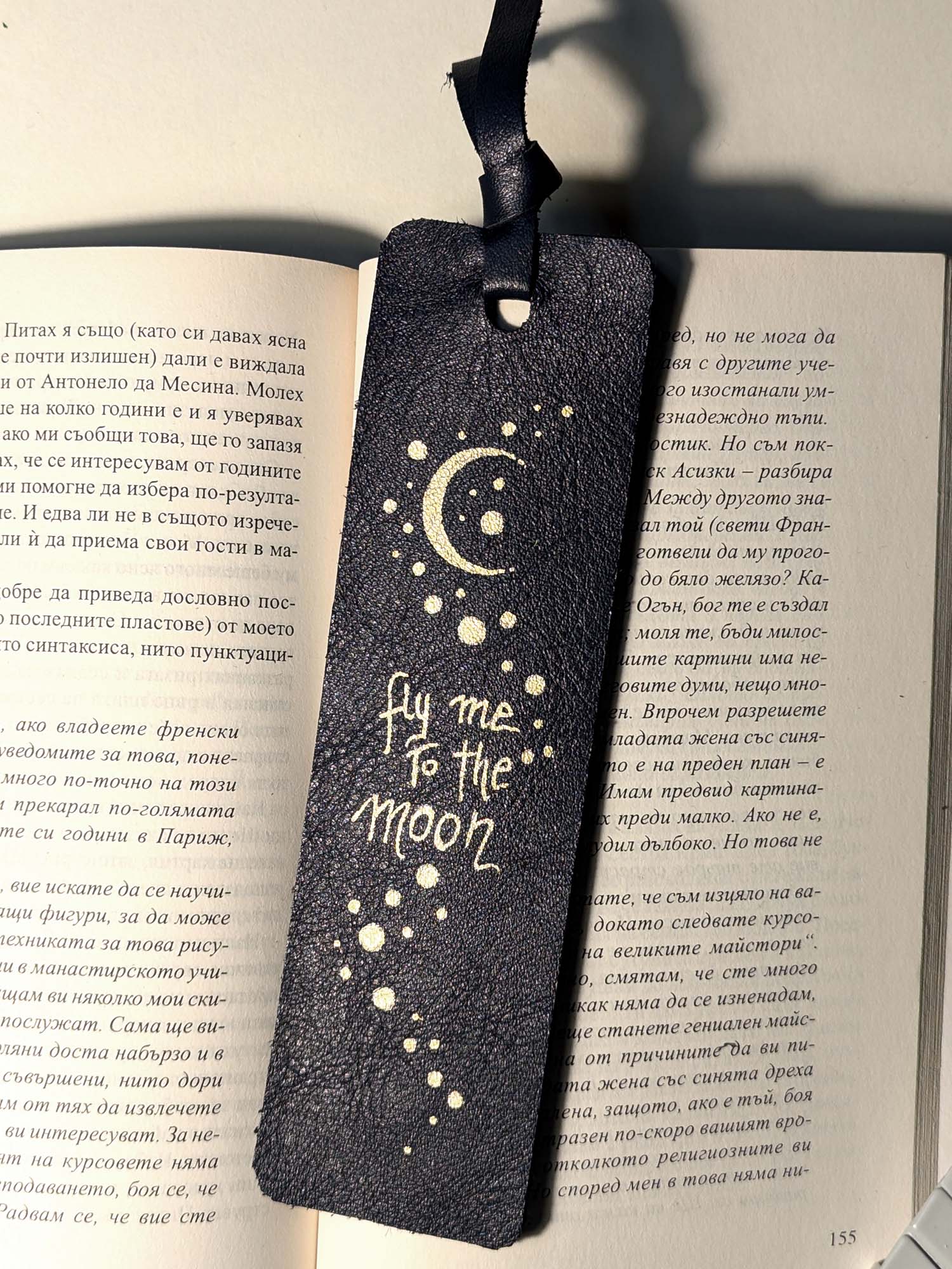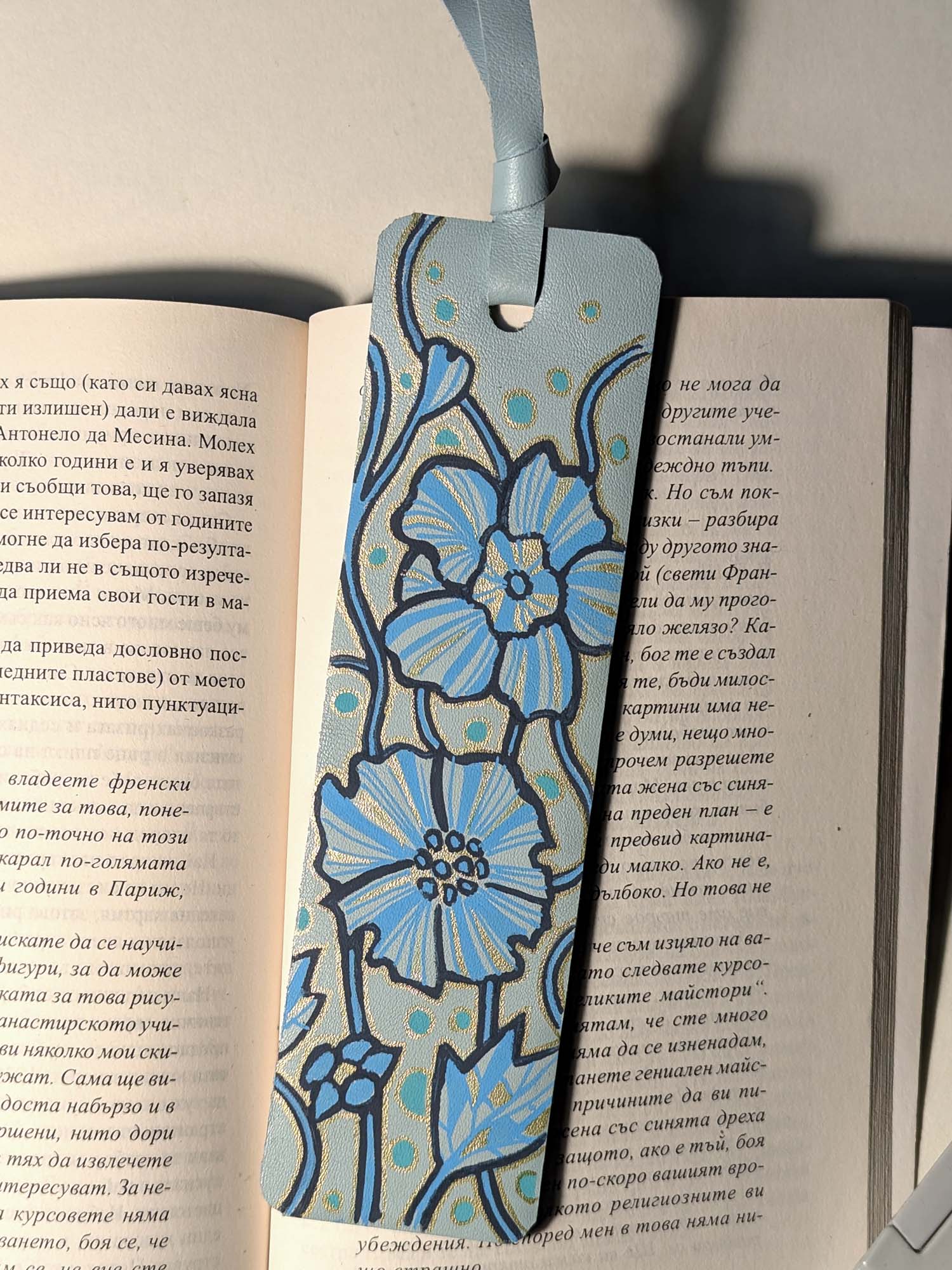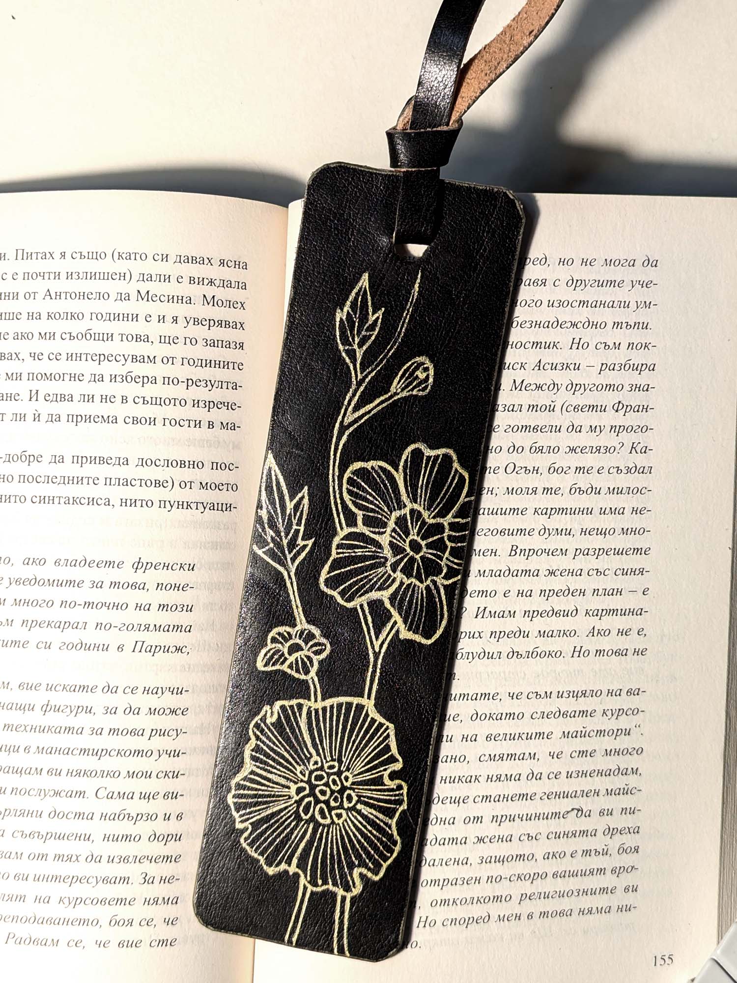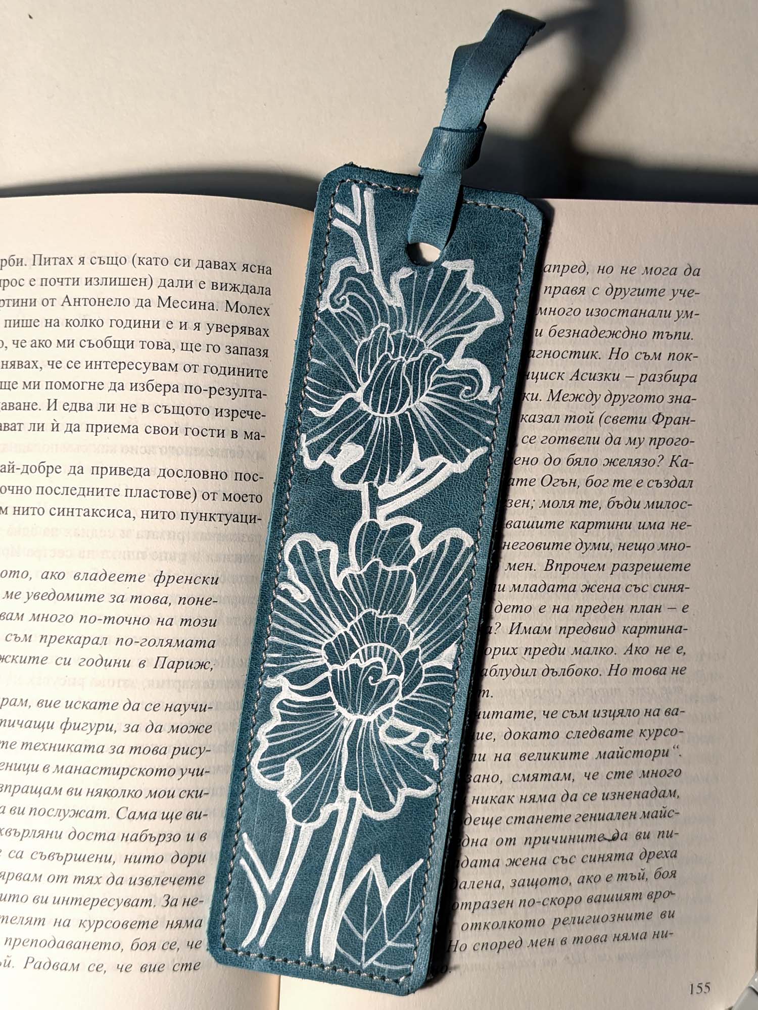 Segnalibro fatto a mano e decorato a mano con Uni Posca. Materiale: pelle Misura: 5×18 cm