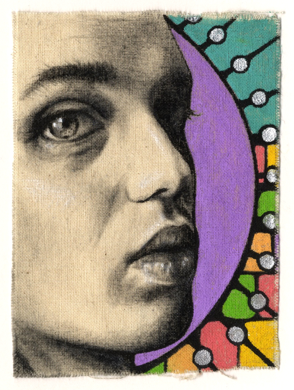 Grafite, pennarelli colorati, su campione di tela 2024 10×7 cm