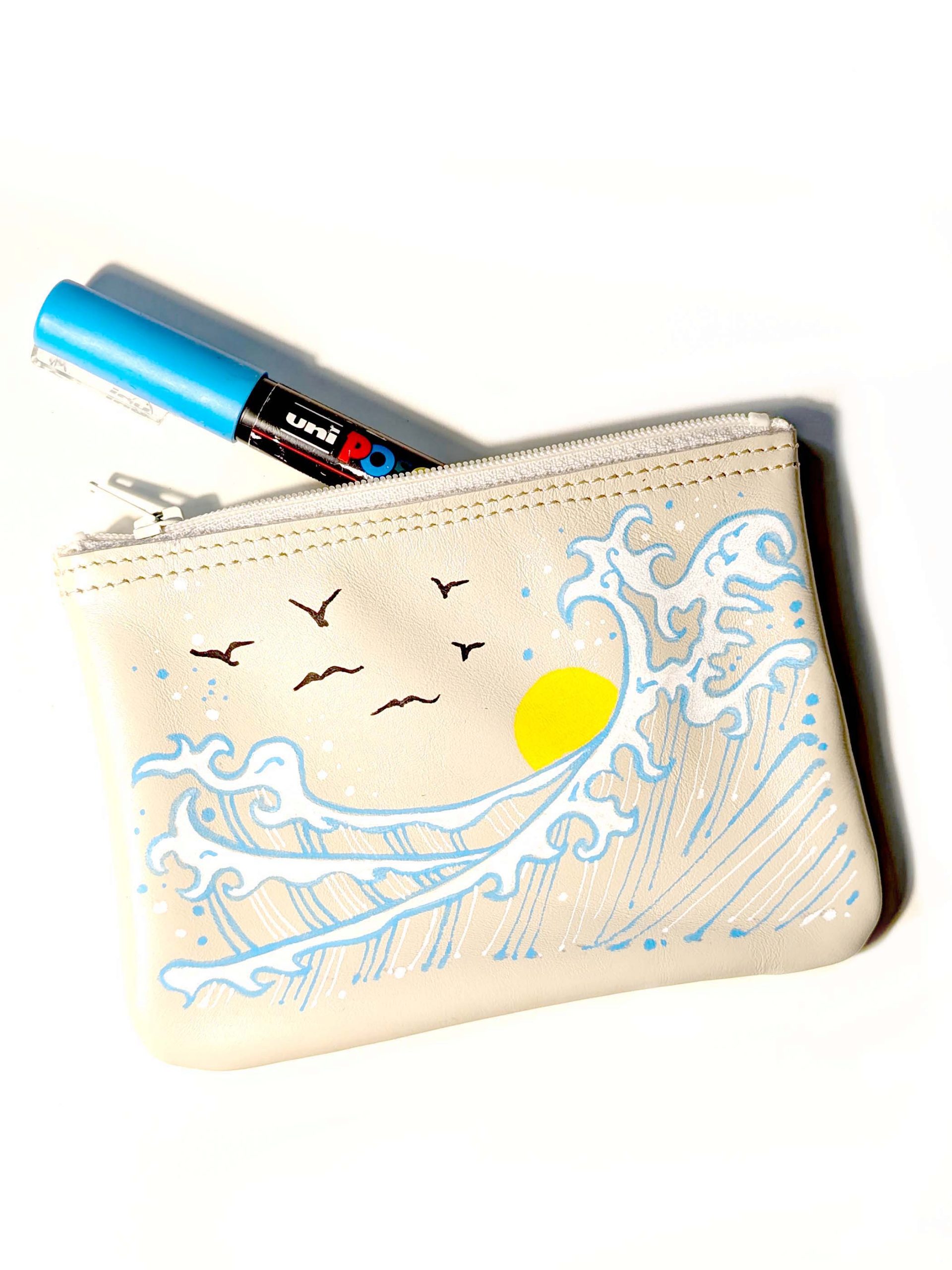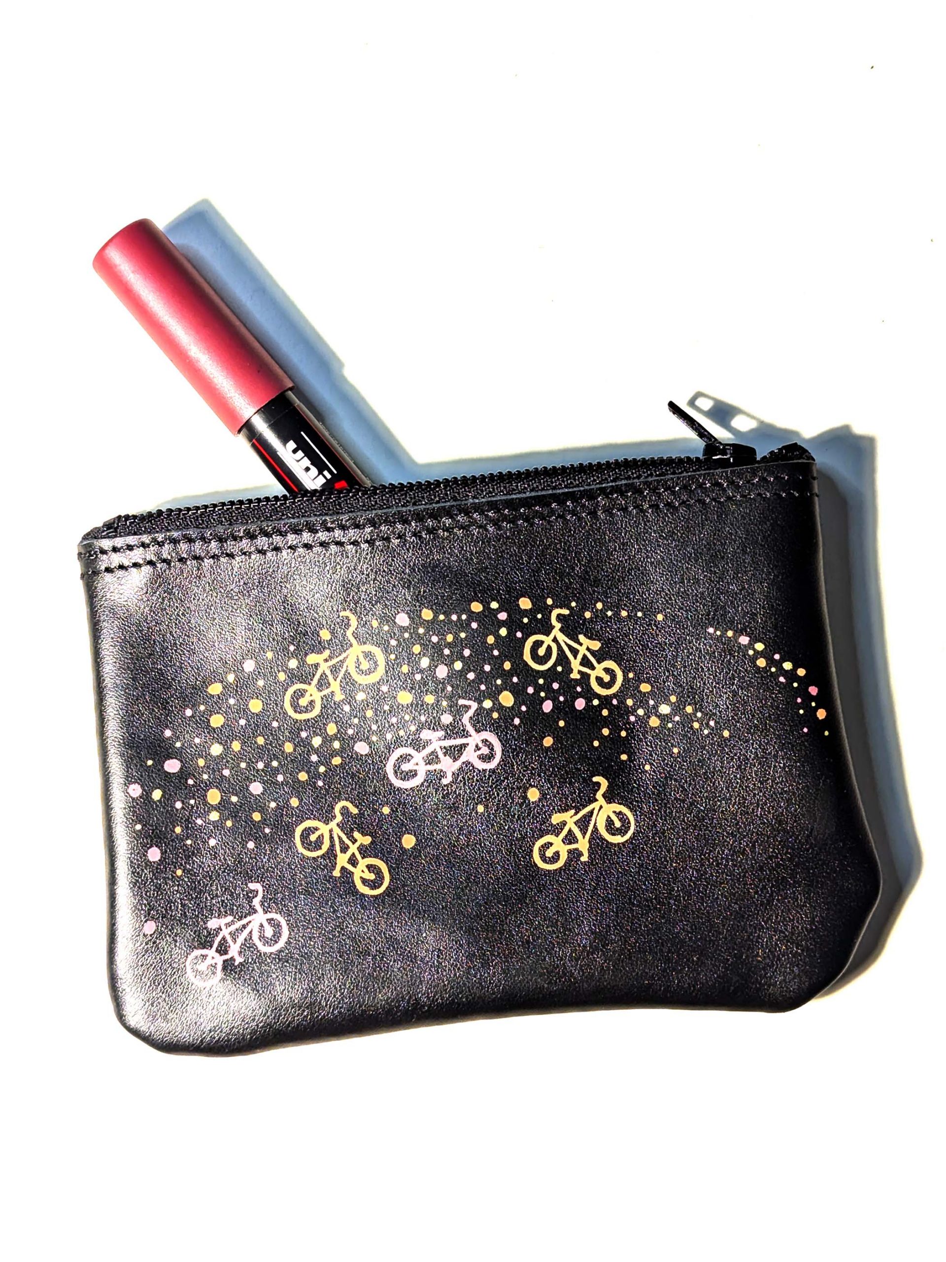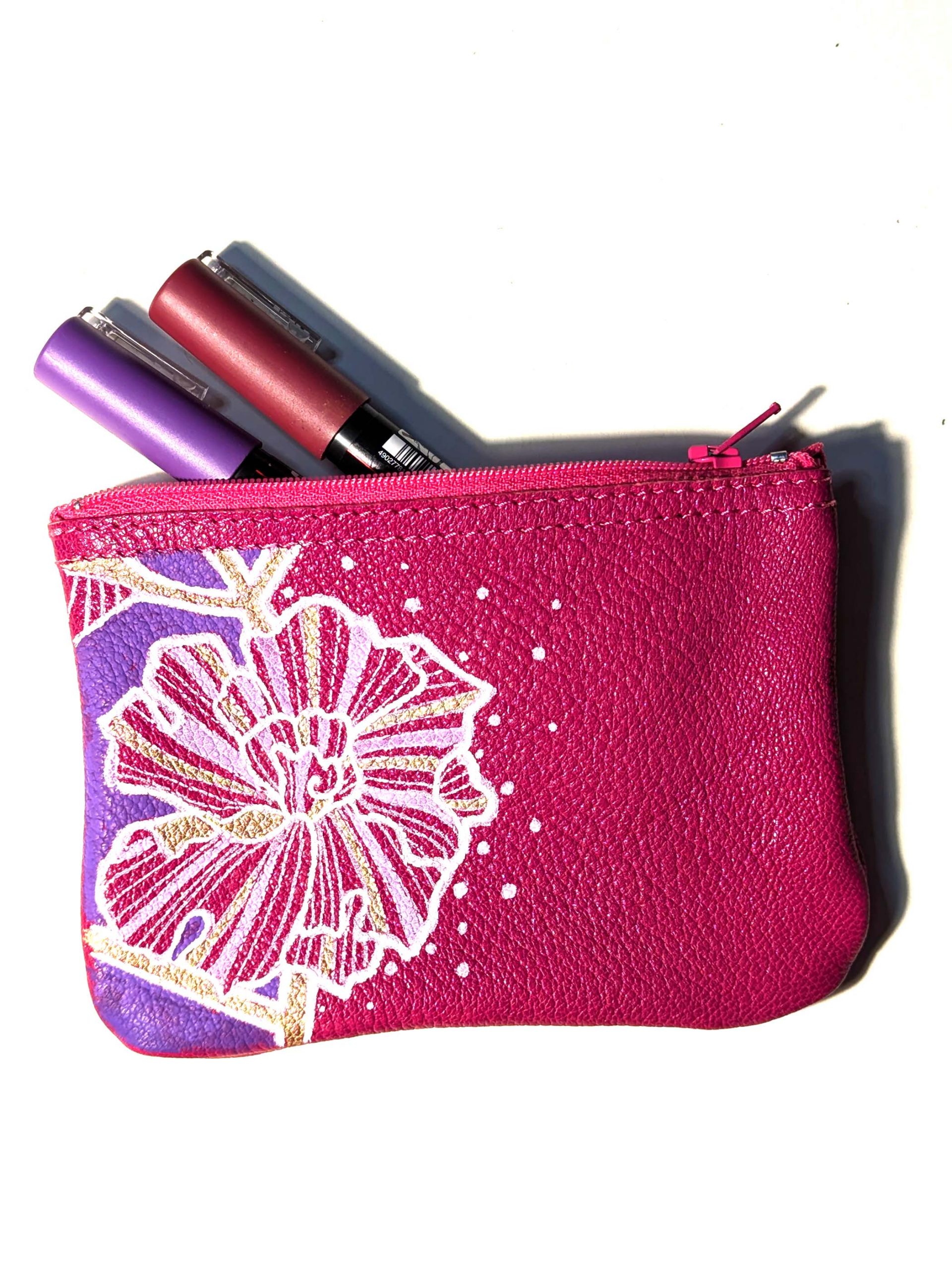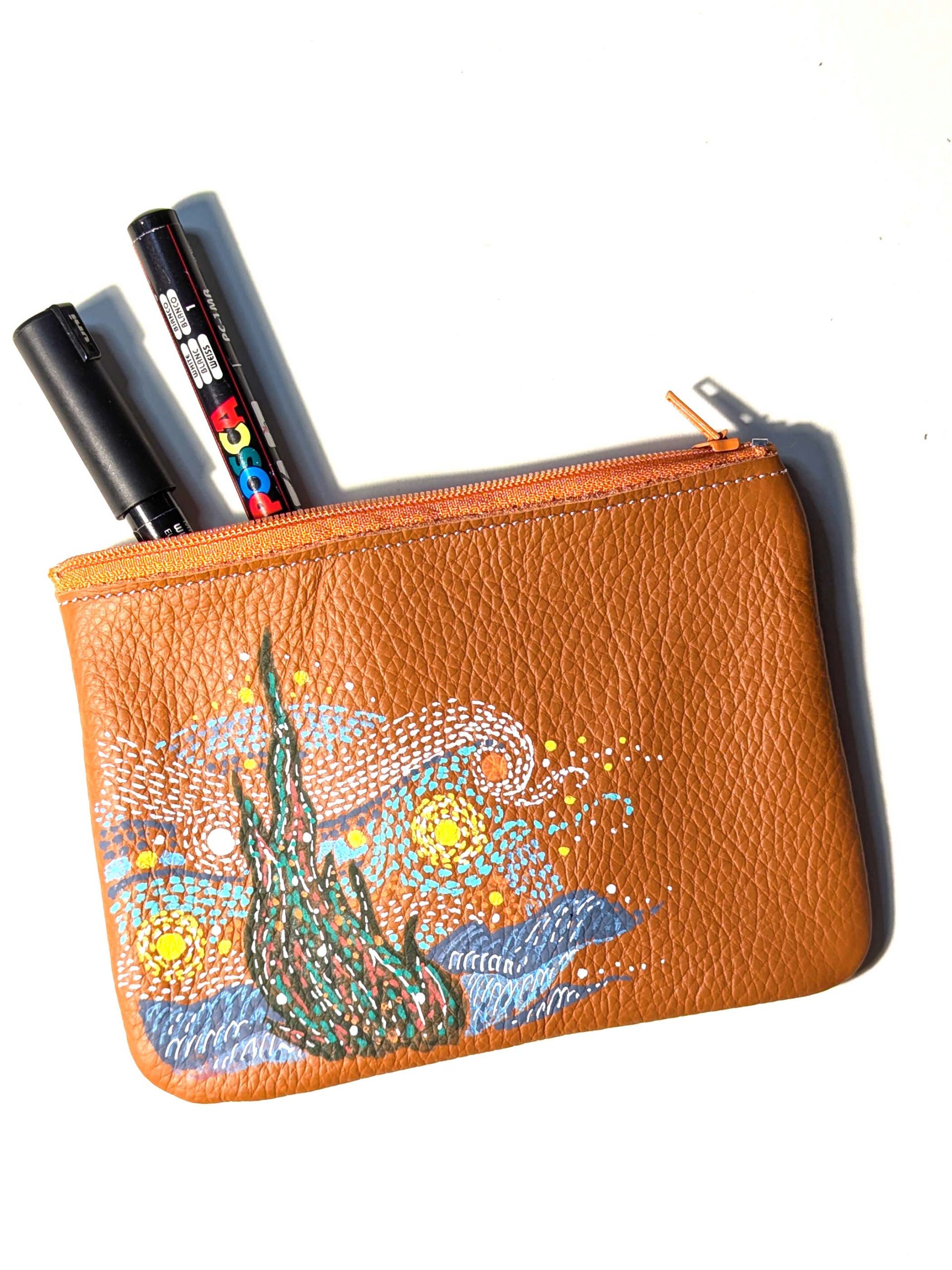 Pouche handmade and hand-decorated with Uni Posca markers. Material: leather Size: 11x18 cm