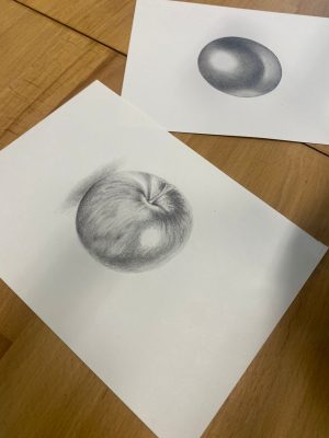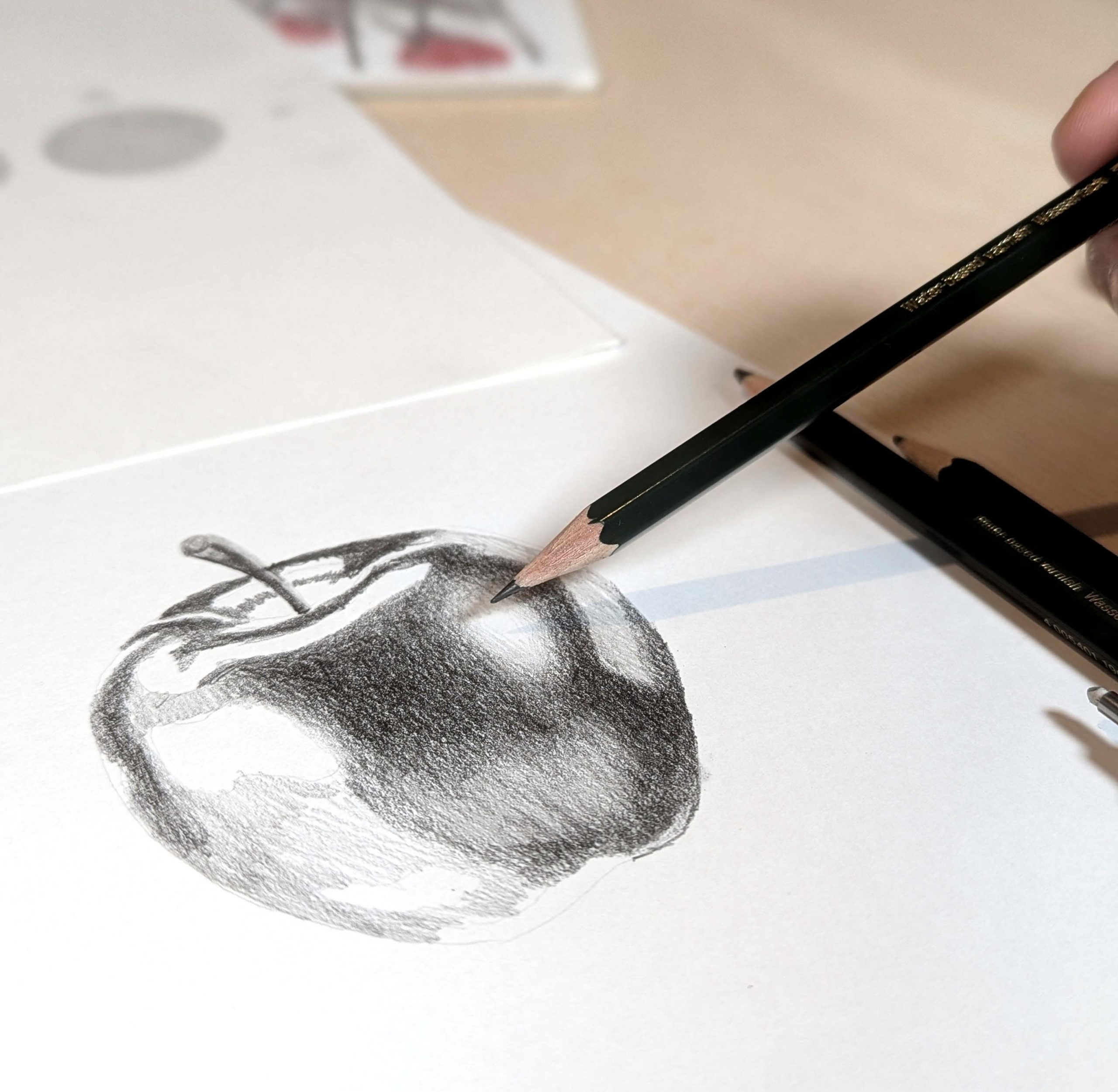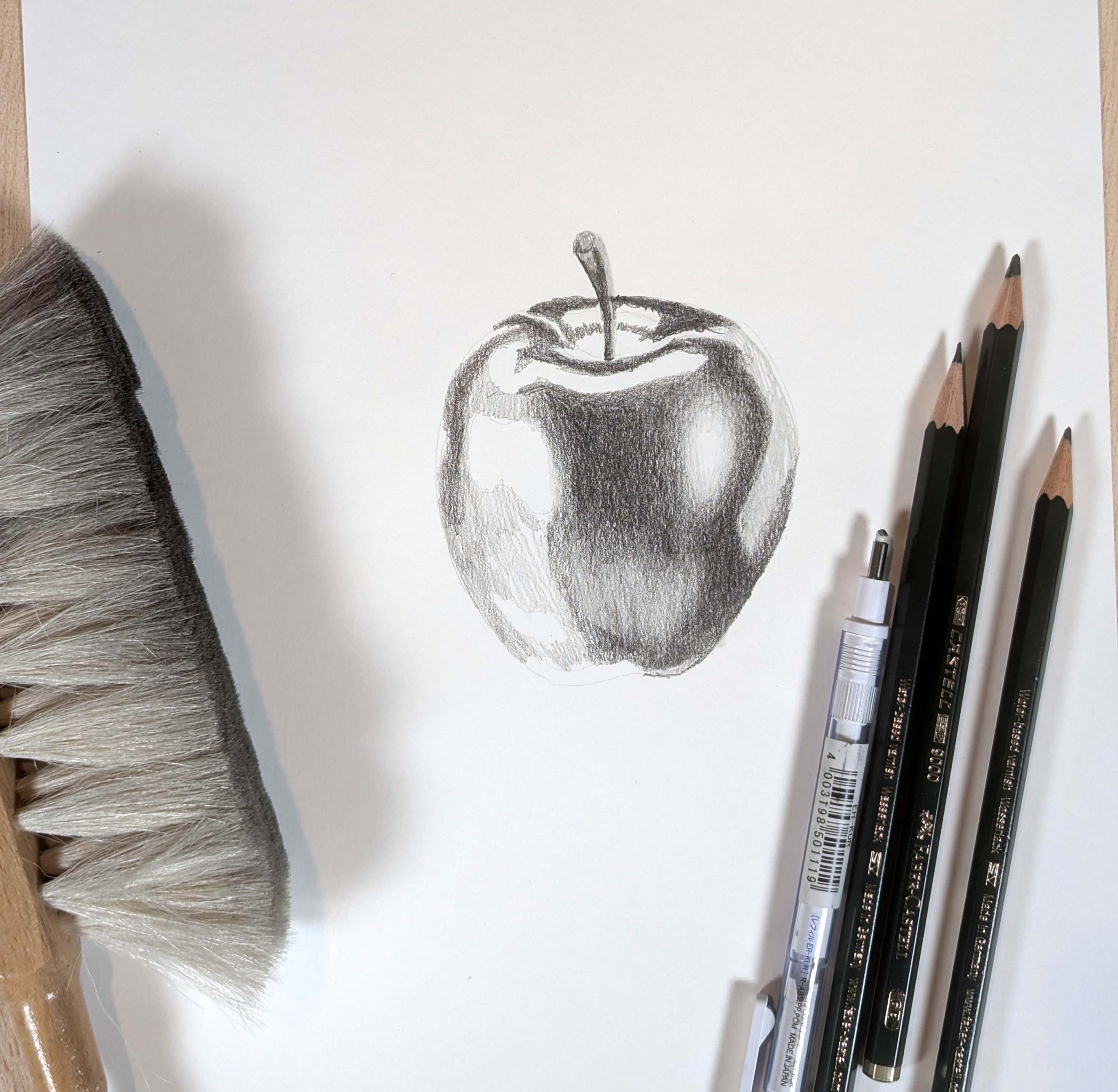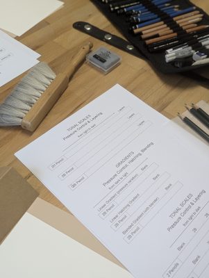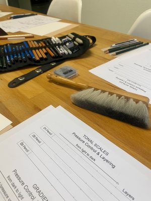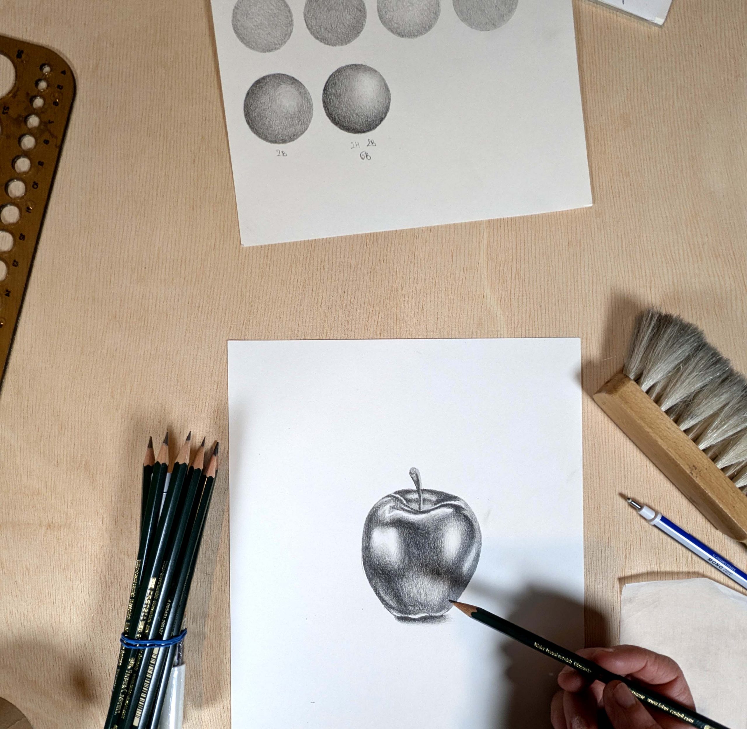 - Introduction to materials. Getting familiar with the tools we will use, exploring the differences between pencils of various hardness. Using graphite grades such as 2H, 2B, and 6B to achieve a rich tonal range from light to dark.