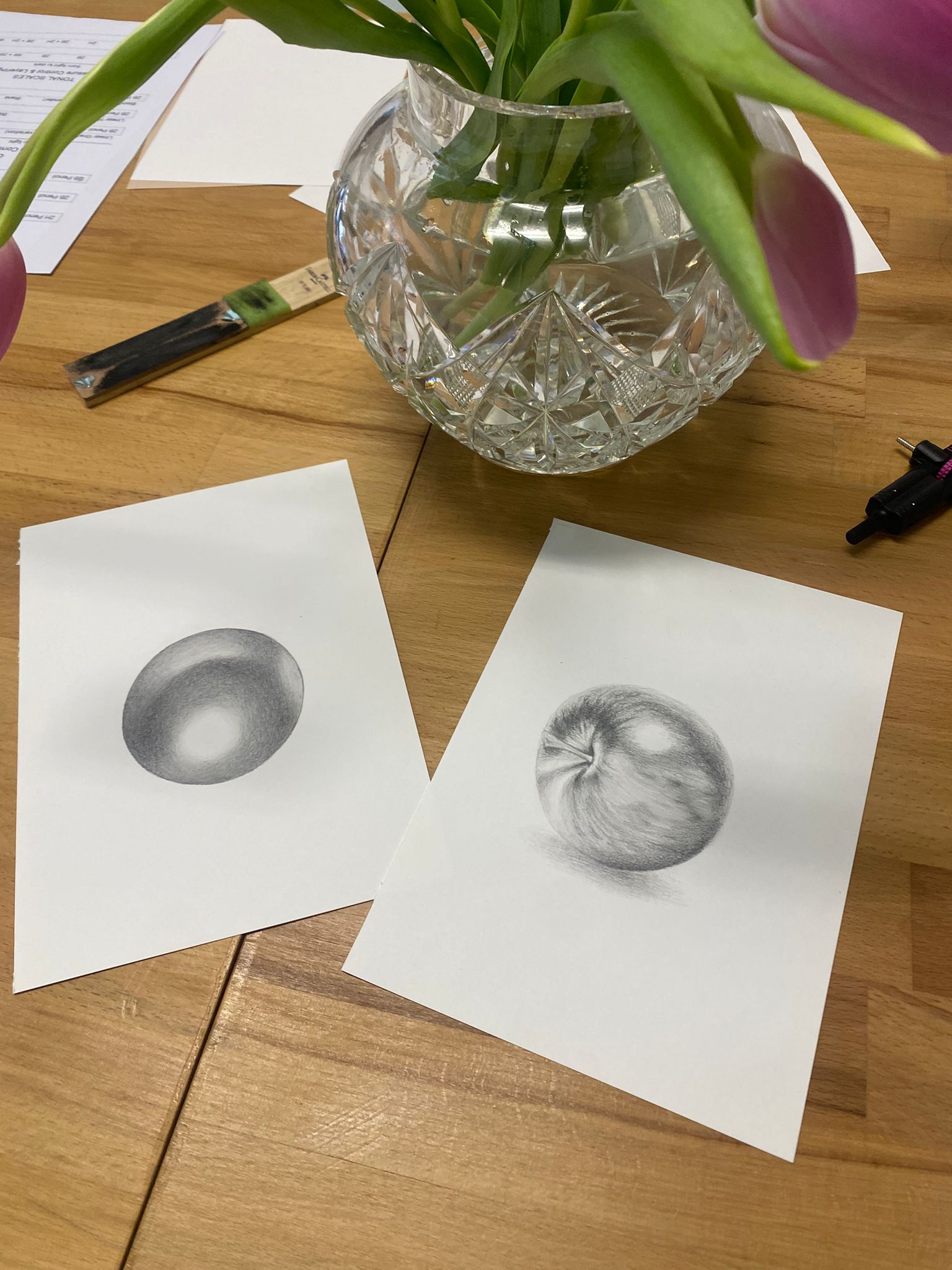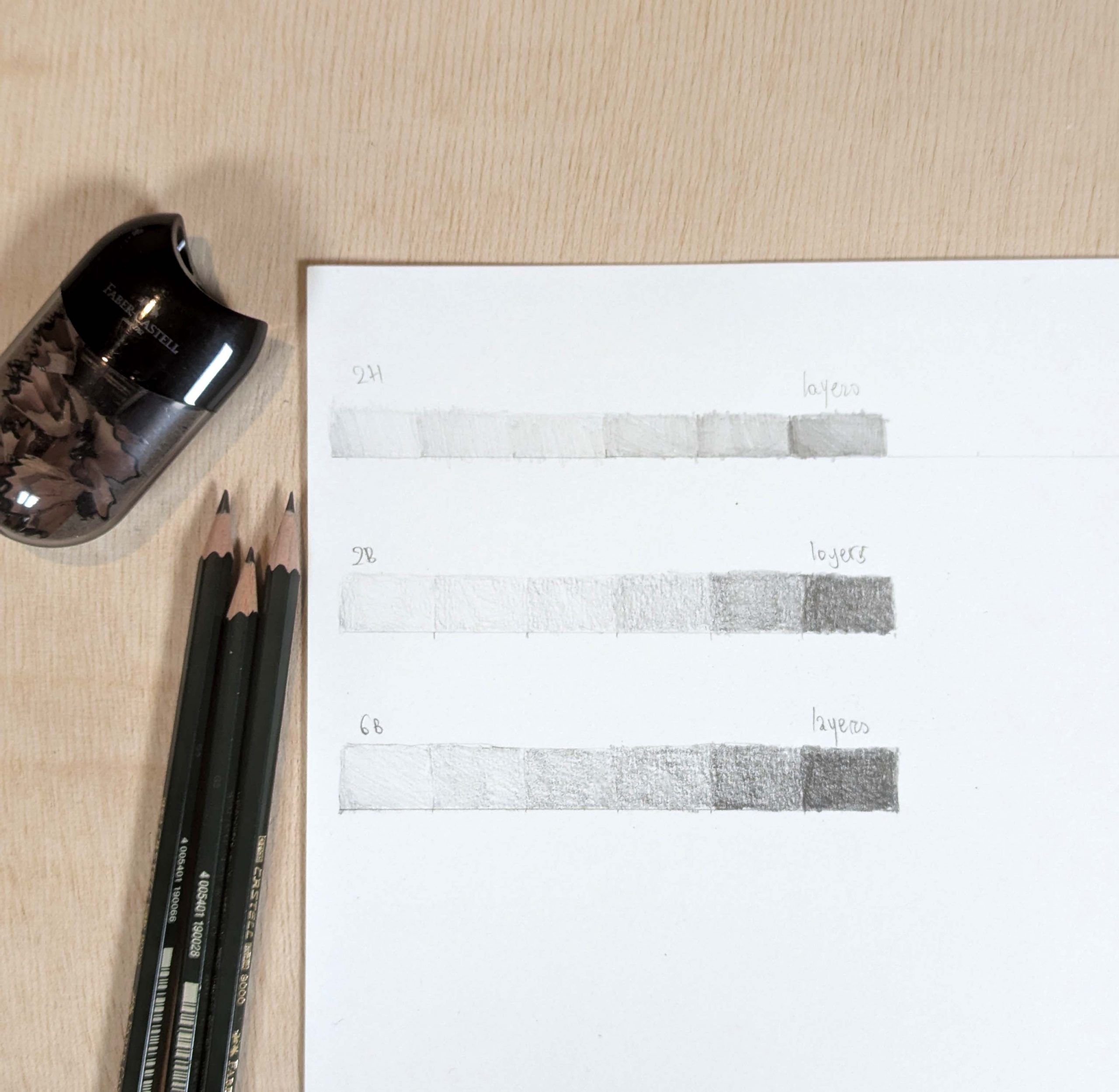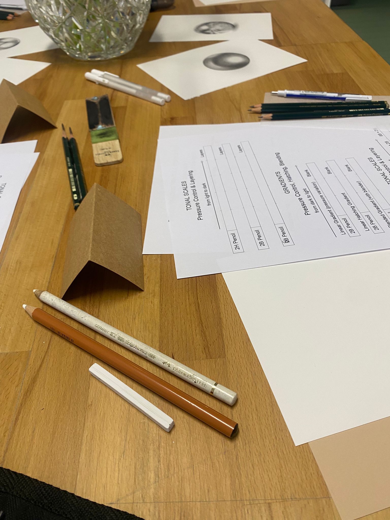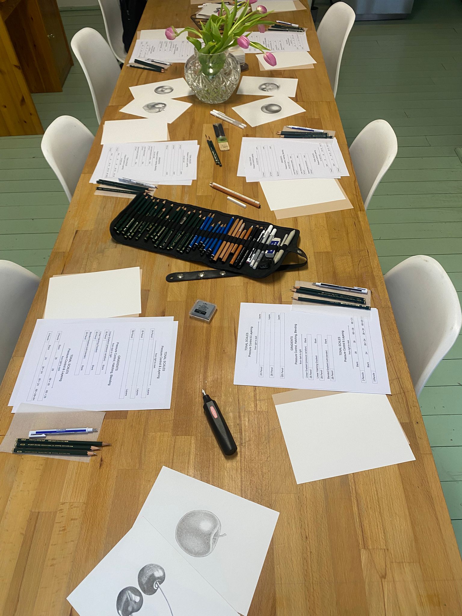 - Introduction to materials. Getting familiar with the tools we will use, exploring the differences between pencils of various hardness. Using graphite grades such as 2H, 2B, and 6B to achieve a rich tonal range from light to dark.