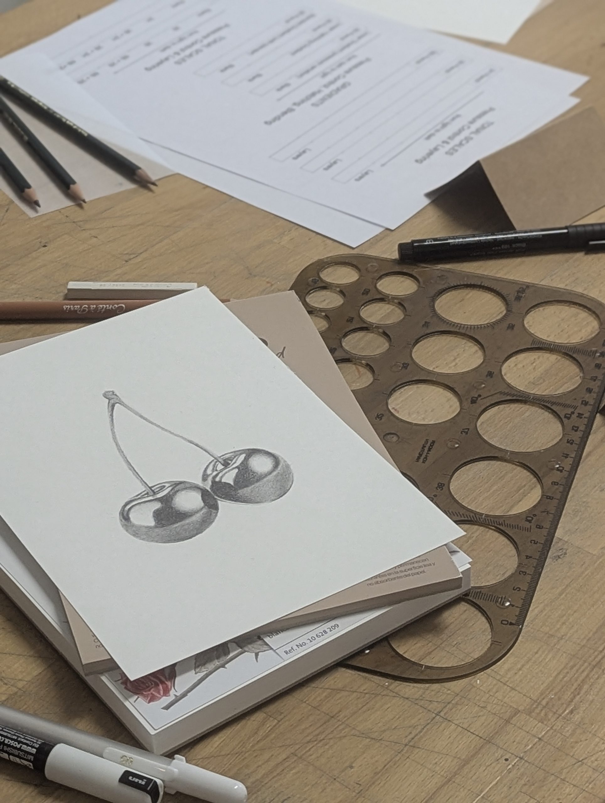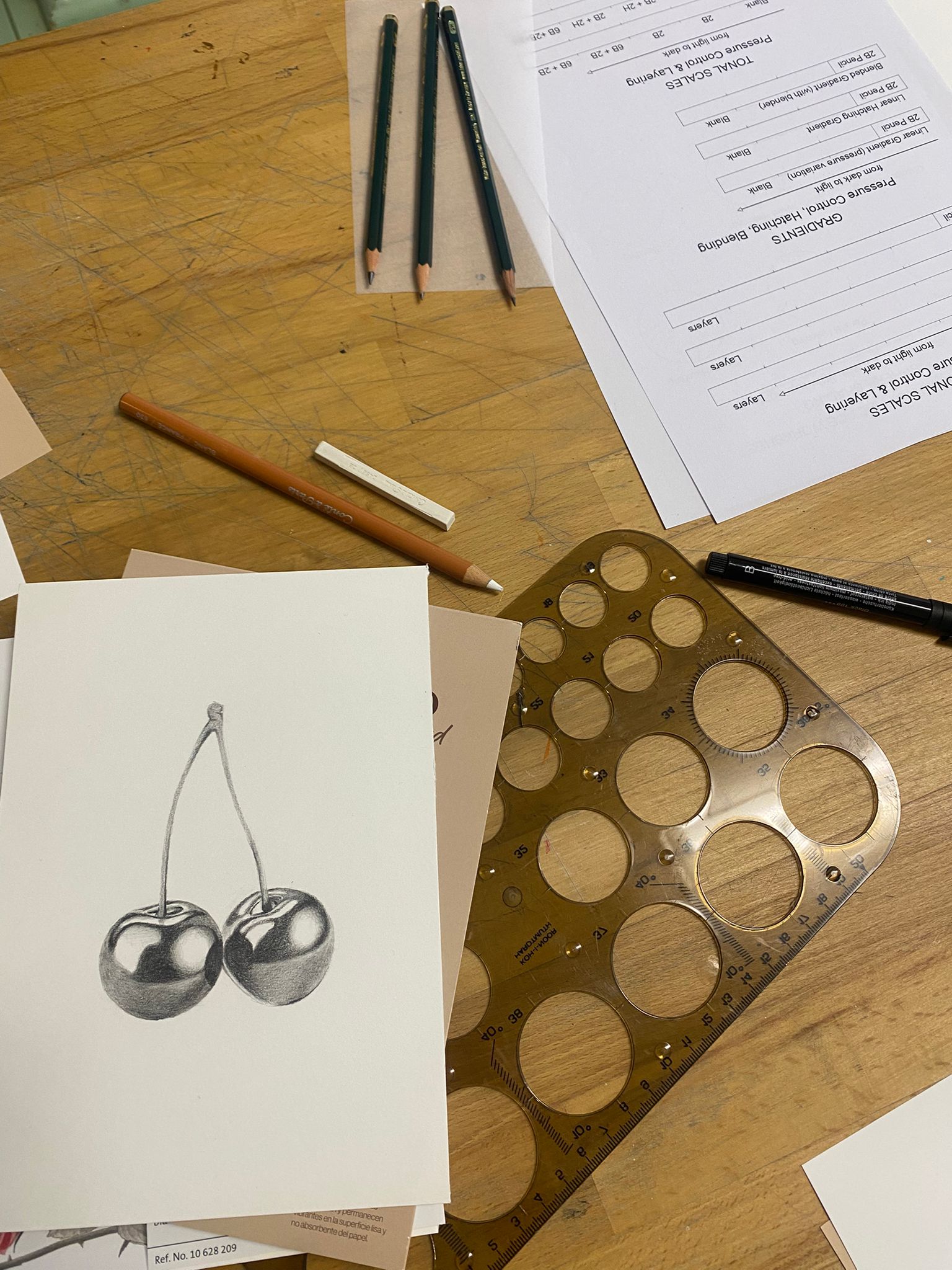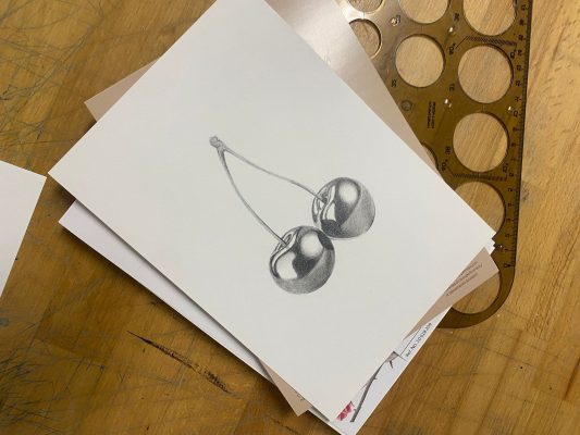 - Sketching practice. Drawing simple objects such as cherries, spheres, or apples to practice pencil shading. Progressive construction of the drawing and conscious use of hatching to define form, depth, and contrast.