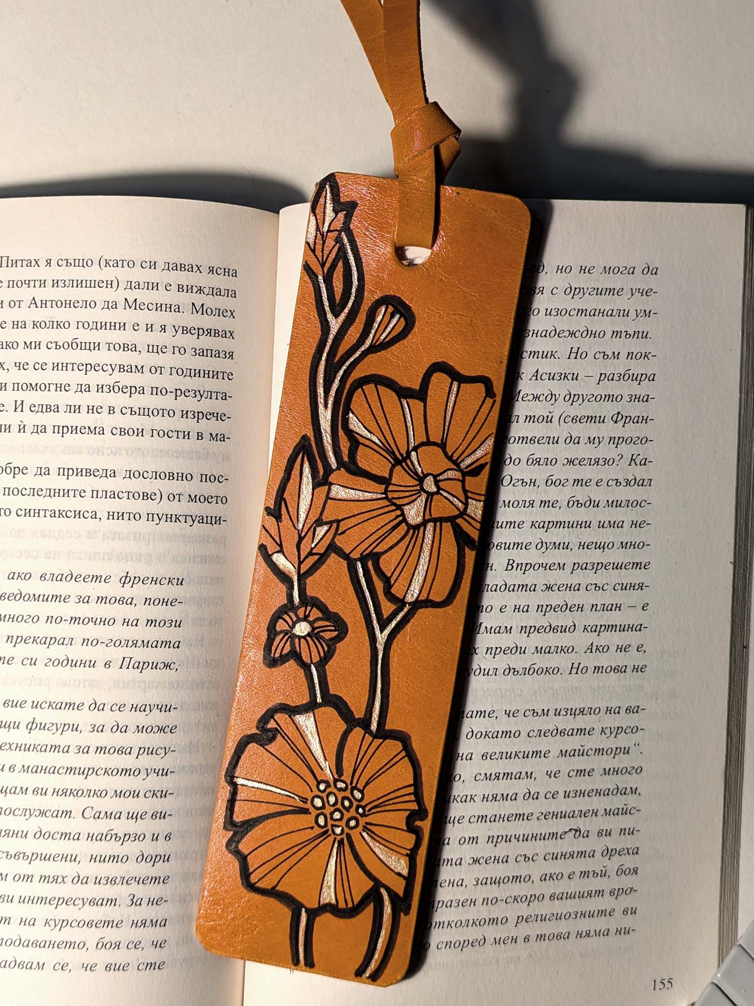 Bookmark handmade and hand-decorated with Uni Posca markers. Material: leather Size: 5×18 cm